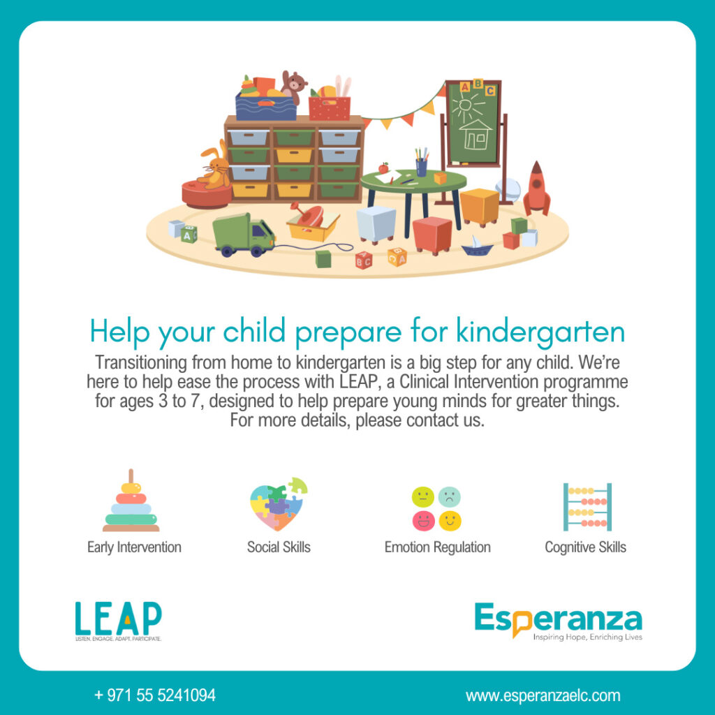 The KHDA (Knowledge and Human Development Authority) oversees inclusive education in Dubai. LEAP helps children develop the specific “School Readiness” skills such as following group instructions, cooperative play, and independence in daily tasks (like managing a lunchbox) that are observed during Dubai school entry assessments.